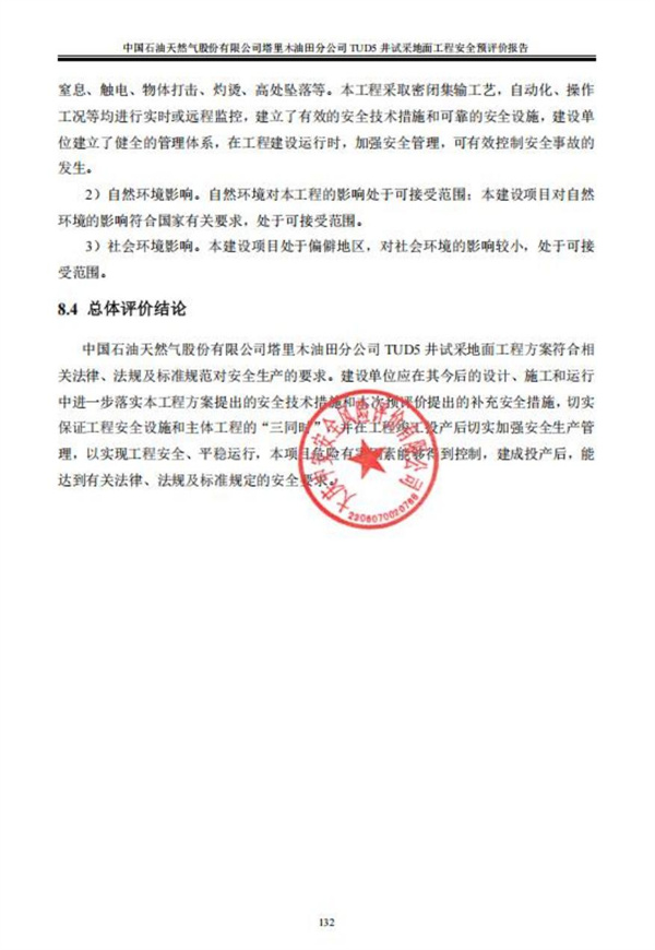 中國石油天然氣股份有限公司塔里木油田分公司 TUD5 井試采地面工程方案 符合相關法律、法規及標準規范對安全生產的要求。建設單位應在其今后的 設計、施工和運行中進一步落實本工程方案提出的安全技術措施和本次預評 價提出的補充安全措施,切實保證工程安全設施和主體工程的“三同時 ”, 并在工程竣工投產后切實加強安全生產管理, 以實現工程安全、平穩運行, 本項目危險有害因素能夠得到控制,建成投產后,能達到有關法律、法規及 標準規定的安全要求。 |