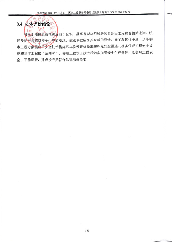 塔里木油田皮山氣田皮山1區(qū)塊二疊系普斯格組試采項目地面工程符合相關(guān)法律、法規(guī)及標(biāo)準(zhǔn)規(guī)范對安全生產(chǎn)的要求。建設(shè)單位應(yīng)在其今后的設(shè)計、施工和運行中進(jìn)一步落實本工程方案提出的安全技術(shù)措施和本次預(yù)評價提出的補充安全措施,確實保證工程安全設(shè)施和主體工程的“三同時”,并在工程竣工投產(chǎn)后切實加強安全生產(chǎn)管理,以實現(xiàn)工程安全、平穩(wěn)運行,建成投產(chǎn)后符合法律法規(guī)要求。 |
