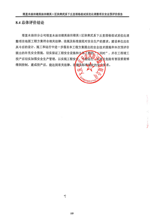 塔里木油田分公司塔里木油田雄英油田雄英1區塊寒武系下丘里塔格組試采優化調整項目地面工程方案符合相關法律、法規及標準規范對安全生產的要求。建設單位應在其今后的設計、施工和運行中進一步落實本工程方案提出的安全技術措施和本次預評價提出的補充安全措施,切實保證工程安全設施和主體工程的“三同時”,并在工程竣工投產后切實加強安全生產管理,以實現工程安全、平穩運行,本項目危險有害因素能夠得到控制,建成投產后,能達到有關法律、法規及標準規定的安全要求。 |