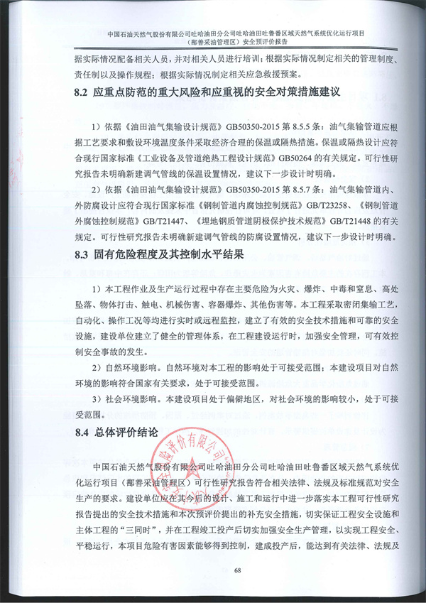 中國石油天然氣股份有限公司吐哈油田分公司吐哈油田吐魯番區域天然氣系統優化運行項目(鄯善采油管理區)可行性研究報告符合相關法律、法規及標準規范對安全生產的要求。建設單位應在其今后的設計、施工和運行中進一步落實本工程可行性研究報告提出的安全技術措施和本次預評價提出的補充安全措施,切實保證工程安全設施和主體工程的“三同時”,并在工程竣工投產后切實加強安全生產管理,以實現工程安全、平穩運行,本項目危險有害因素能夠得到控制,建成投產后,能達到有關法律、法規及標準規定的安全要求。 |
