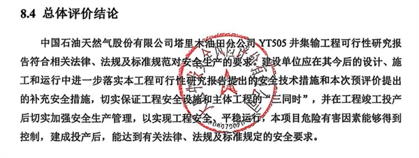 中國石油天然氣股份有限公司塔里木油田分公司YT505井集輸工程可行性研究報告符合相關法律、法規及標準規范對安全生產的要求。建設單位應在其今后的設計、施工和運行中進一步落實本工程可行性研究報告提出的安全技術措施和本次預評價提出的補充安全措施,切實保證工程安全設施和主體工程的“三同時”,并在工程竣工投產后切實加強安全生產管理,以實現工程安全、平穩運行,本項目危險有害因素能夠得到控制,建成投產后,能達到有關法律、法規及標準規定的安全要求。 |